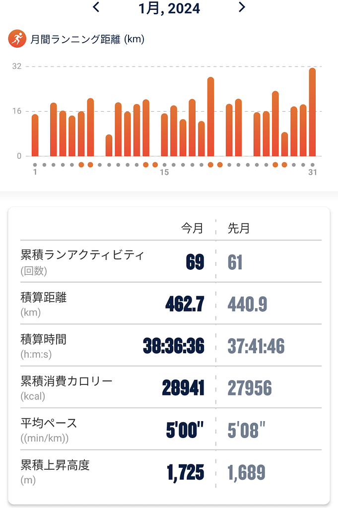 1月は子供が生まれた影響で、時間短縮のために愛犬の散歩(約2km)も走り、距離稼ぎをしていたため、アクティビティ数がすごいことになっています笑