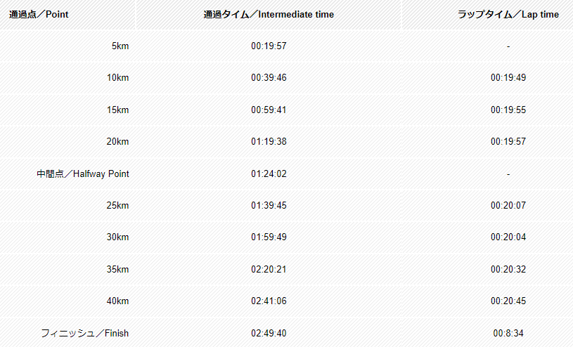 NET 2:49:40(前半1:24:02、後半1:25:38)。
